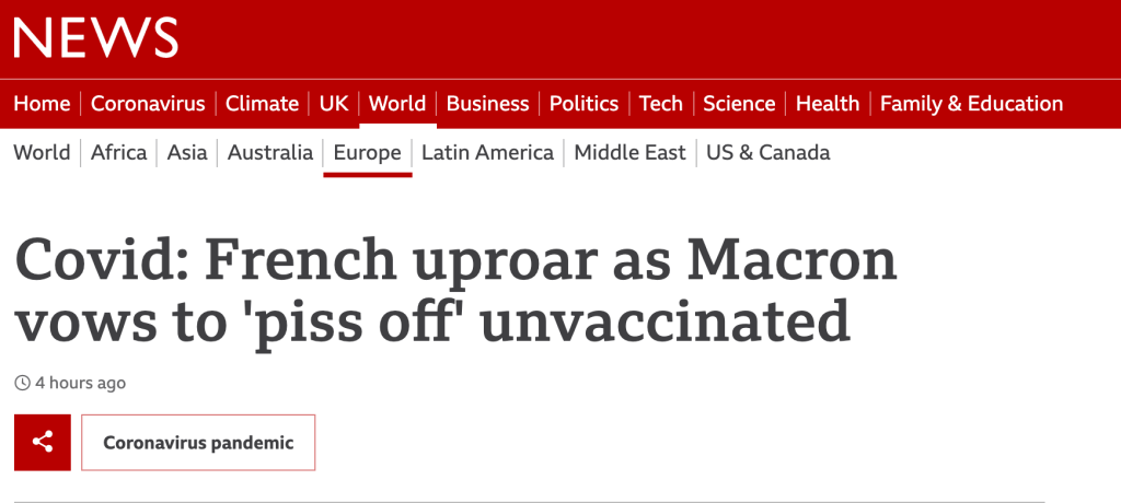 French President Emmanuel Macron has had strong words to say about France’s unvaccinated this morning.