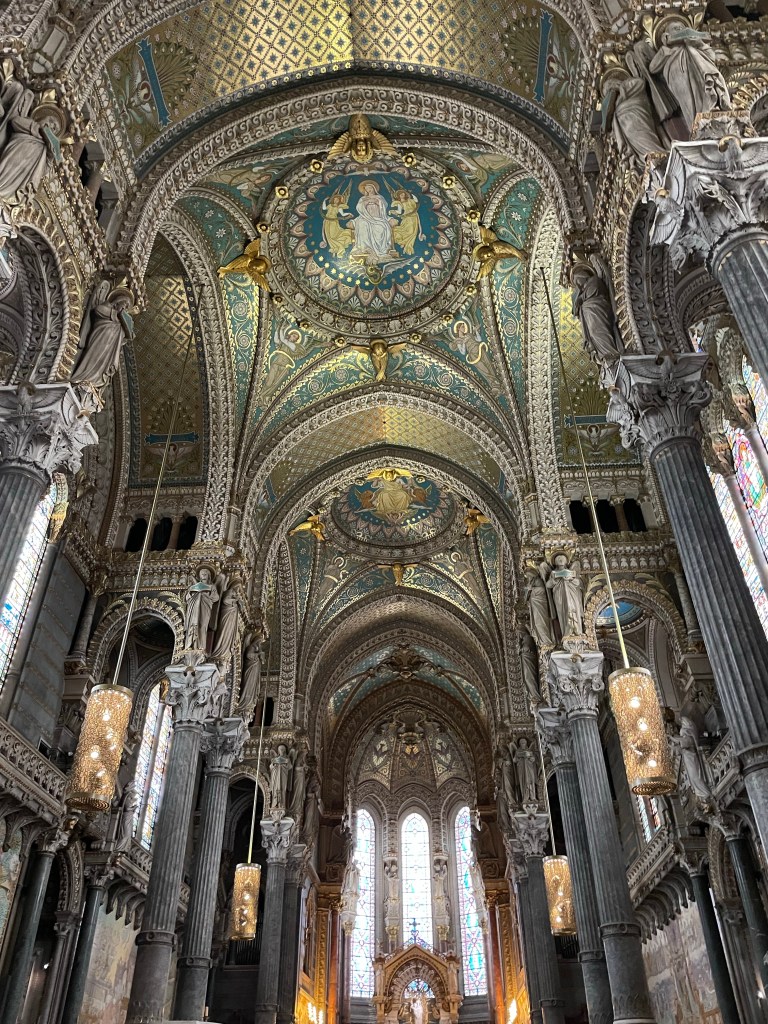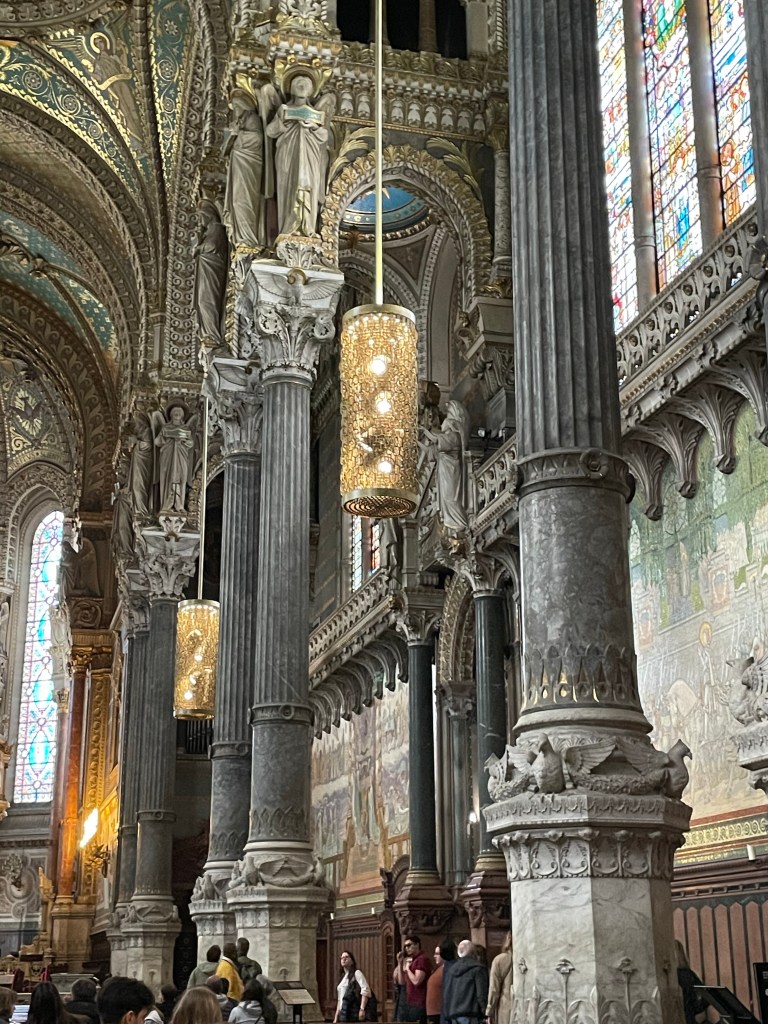 We took the funicular up the steep climbLa Basilica de Notre Dame de Fourviere is impressiveReally beautiful detailsInside was impressive too