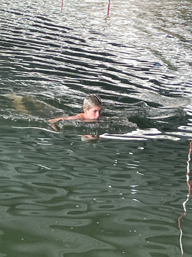 It was warmer than in March and I managed to swim for a bit longer. And of course we had a little helper with us.