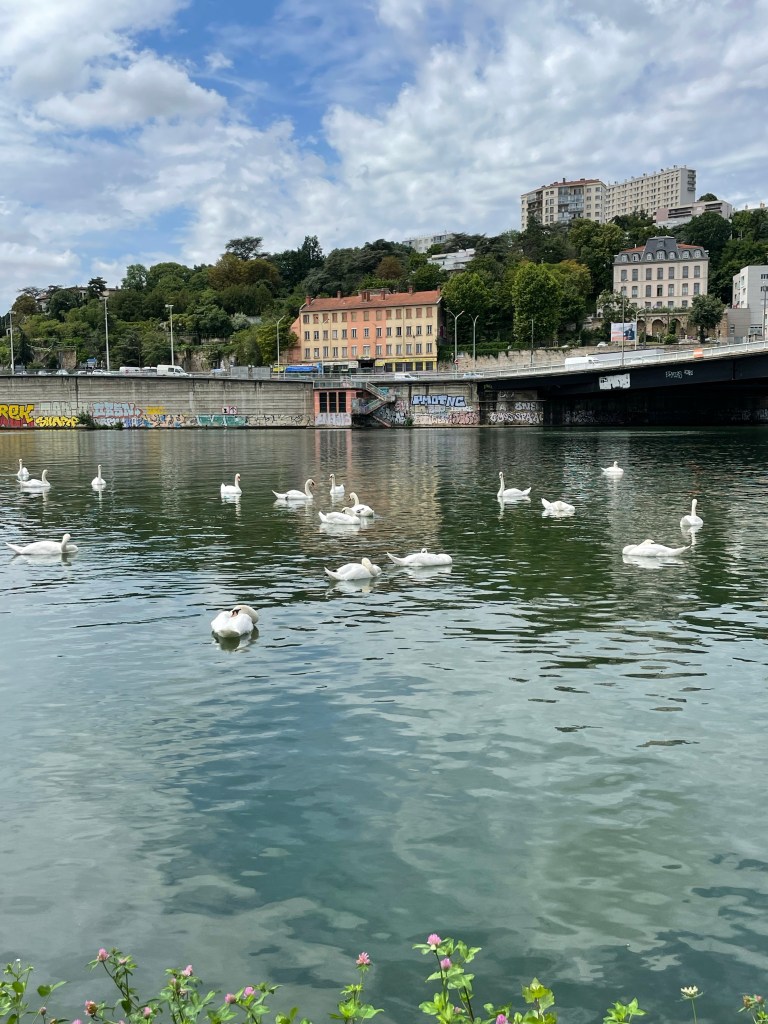 A bank of swans on the Saône – 17 of them in fact. Dix-sept cygnes.