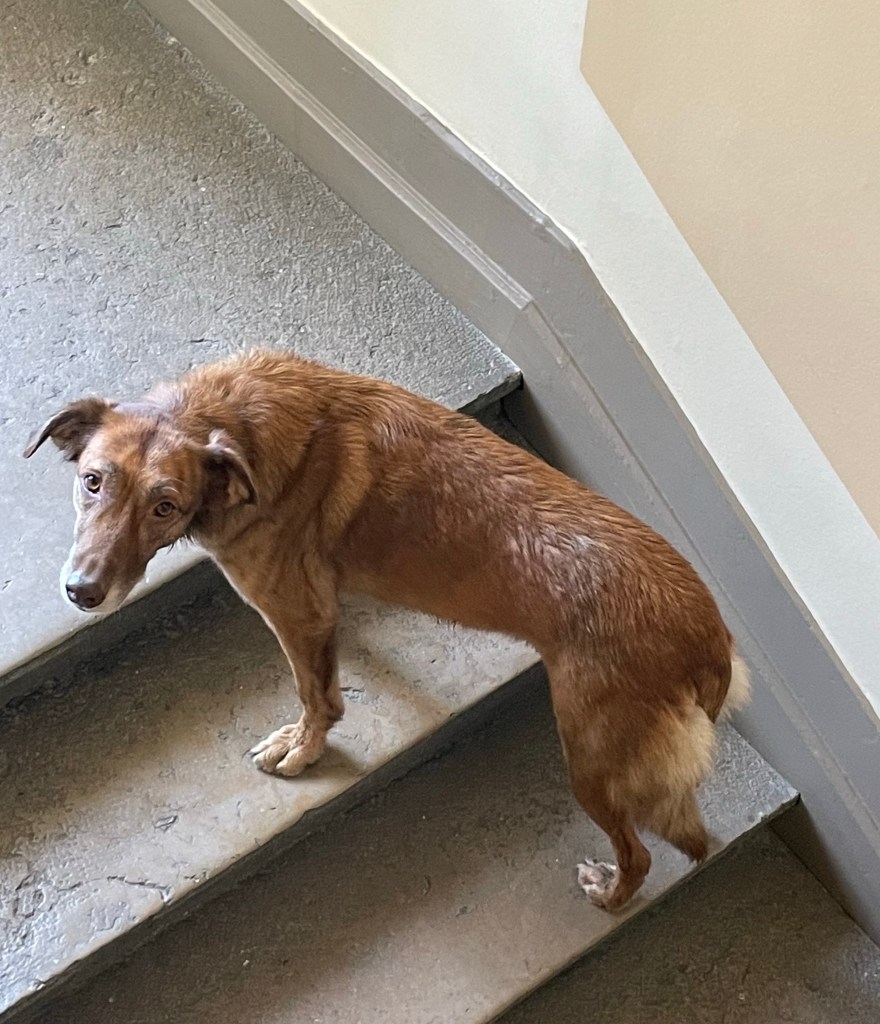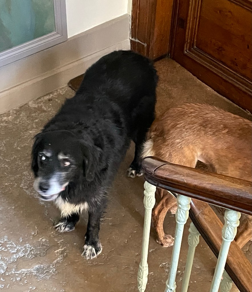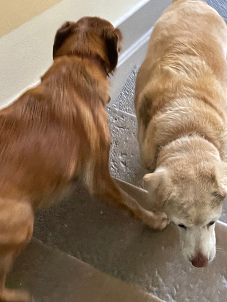 Notre voisin en dessous a trois chiens. Quelque fois quand je descends un m’accompagne.