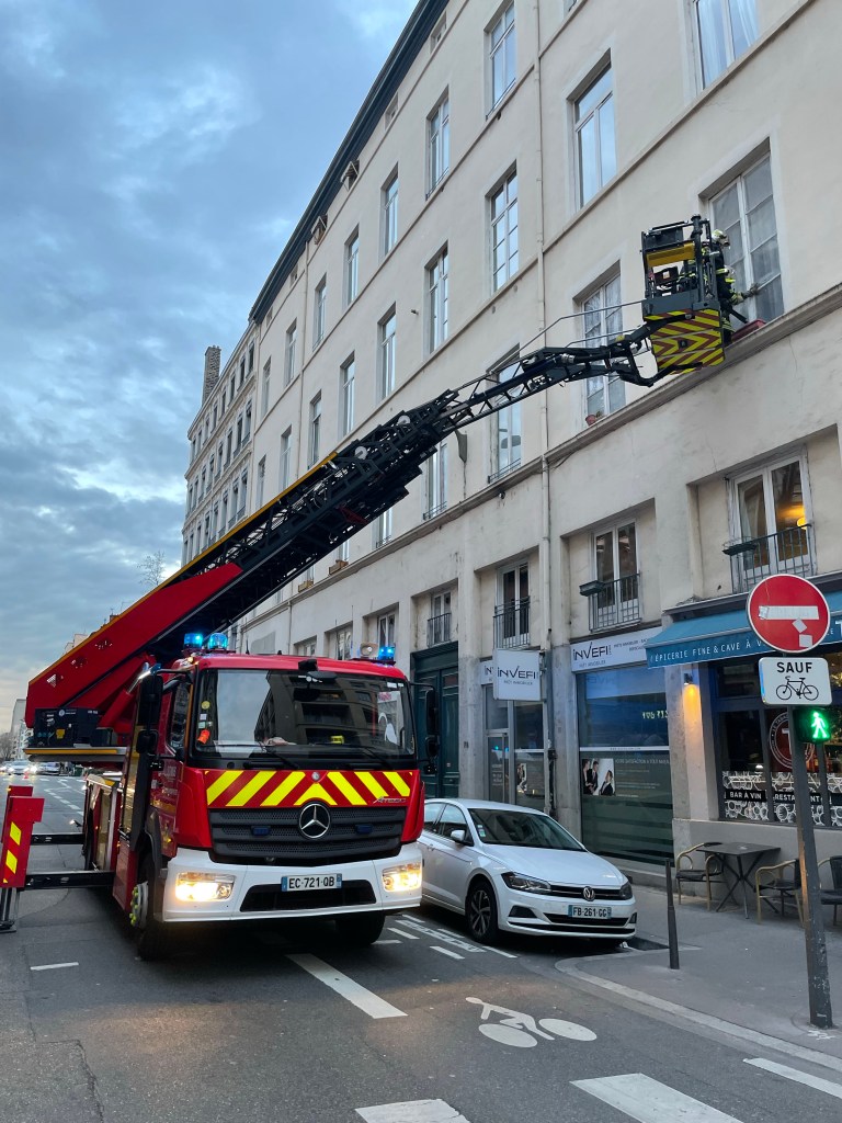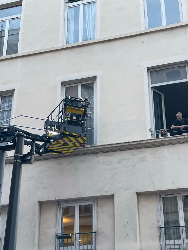 An evening stroll around le voisinage and we came across les pompiers in action. They were breaking down a second floor window to gain access. I’m guessing someone inside was in difficulty.
