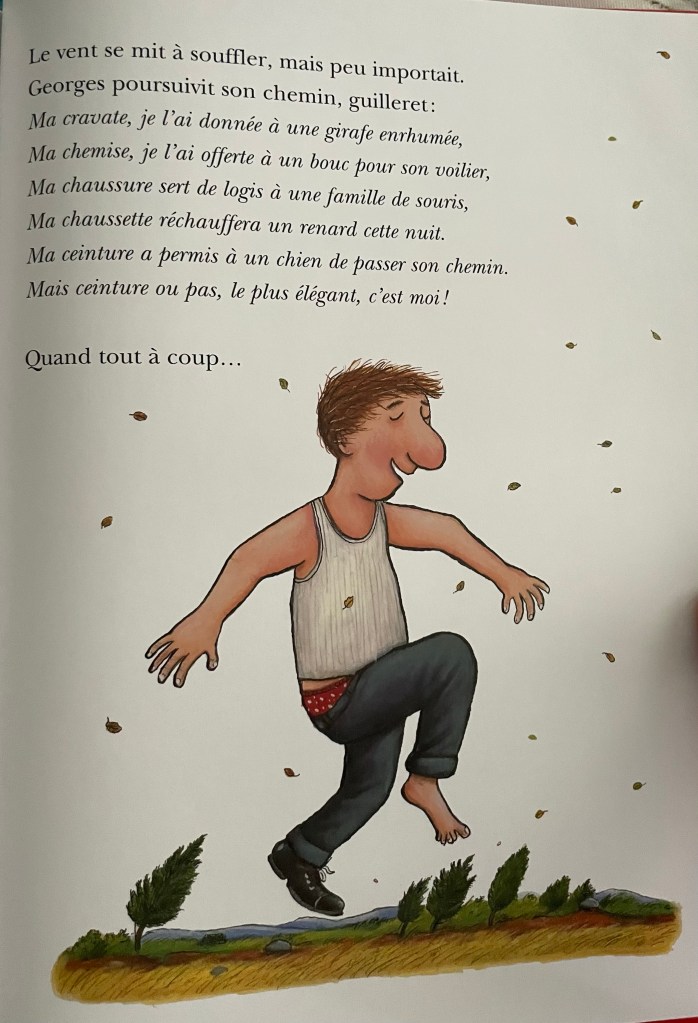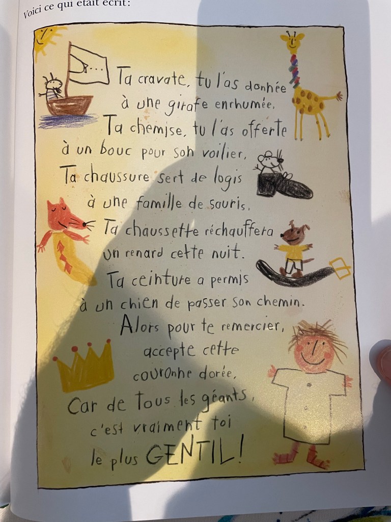 My tie is a scarf for a cold giraffe, my shirt’s on a boat as a sail for a goat, my shoe is a house for a little white mouse, one of my socks is a bed for a fox, my belt helped a dog who was crossing a bog, but look me up and down I’m the smartest giant in town.