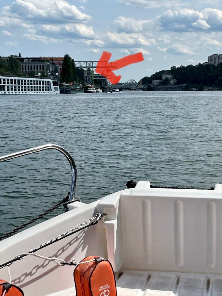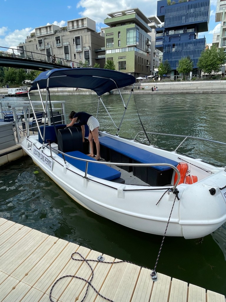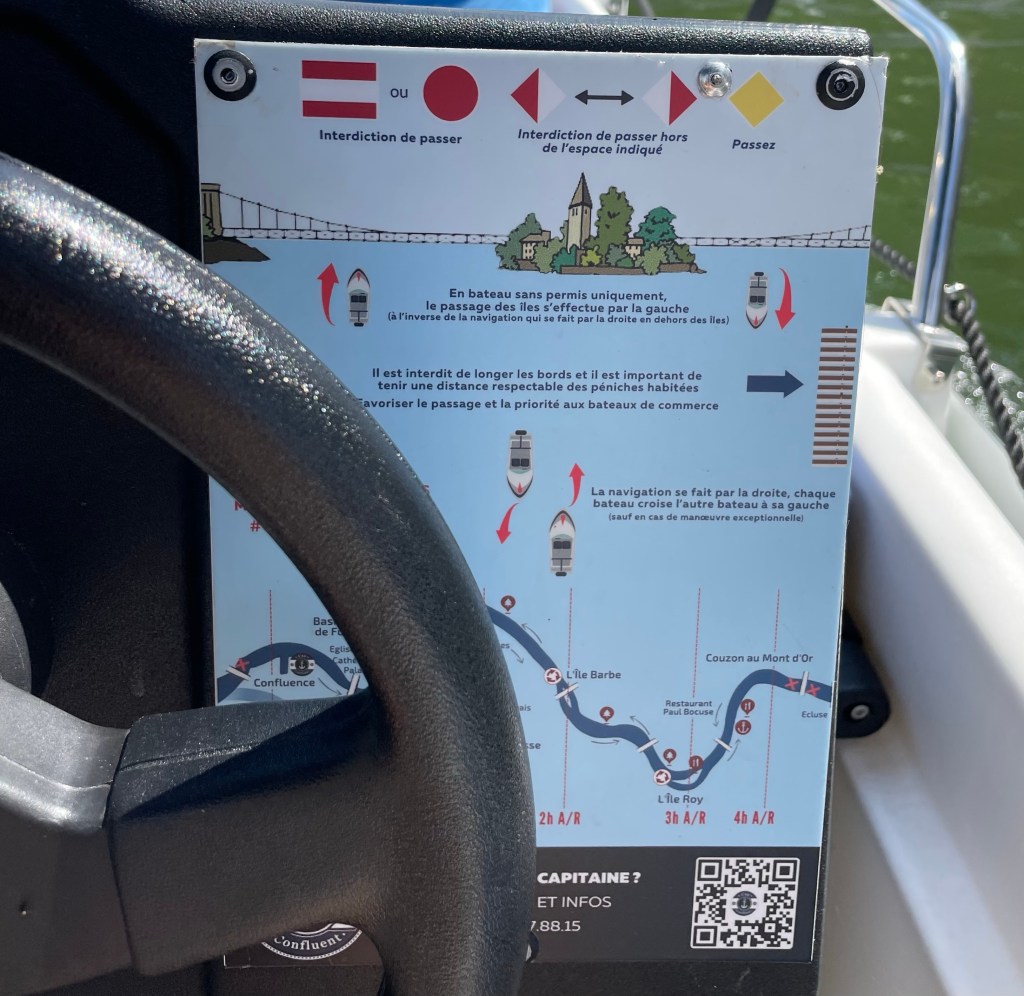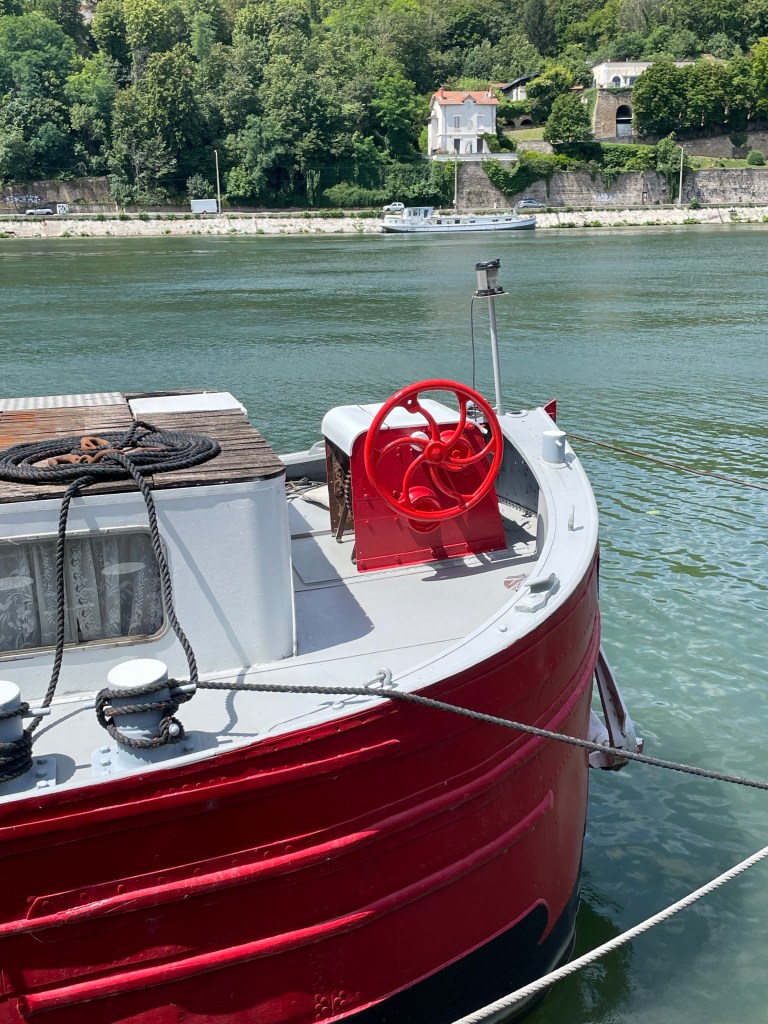 It was a nice sunny day so Cath and I decided to try a bit of sailing/steering/driving a boat along the Saône. We had spotted a company that let you take a boat out without a licence at Confluence so after a very brief chat about the rules of the waters and how to drive the thing, we took to the waters.
