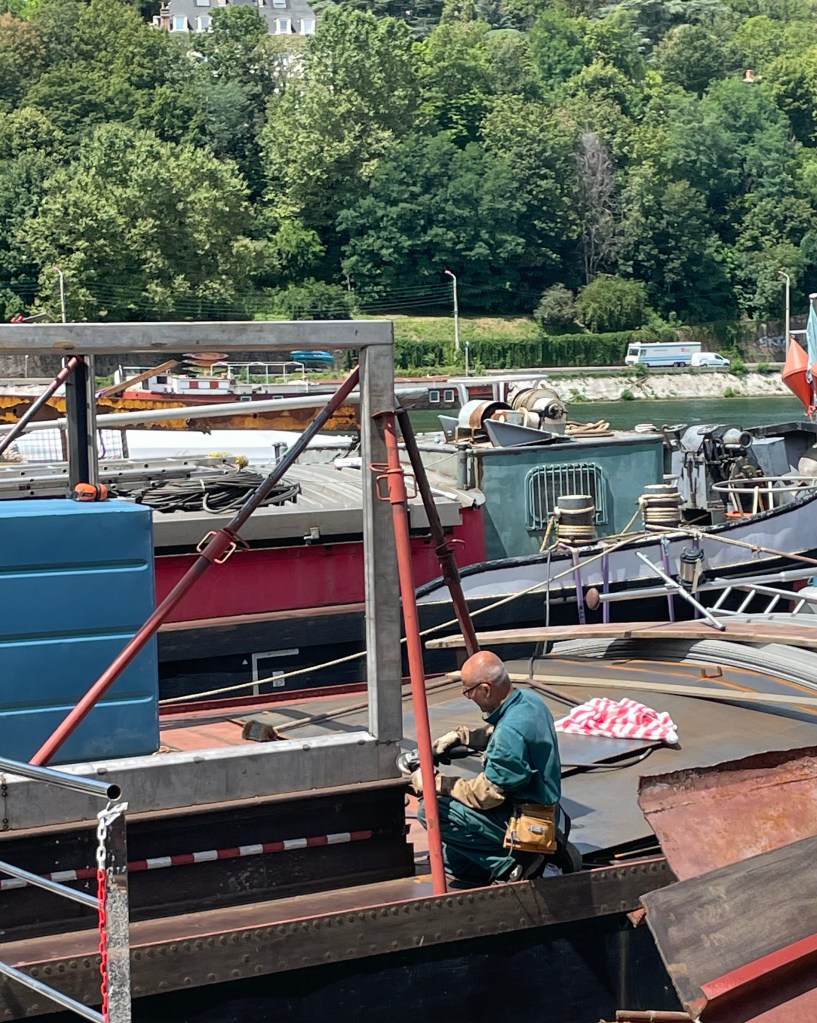 Cet homme pratique son swing sur un bateau dans la Saône.