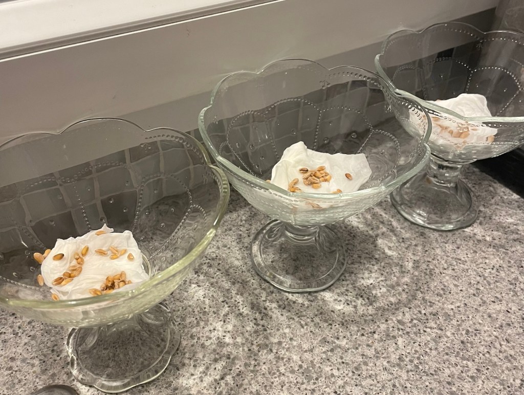 The woman explained that yesterday – 4 December was the feast of Sainte Barbe and the Provençal tradition is to sow wheat seeds in three containers.