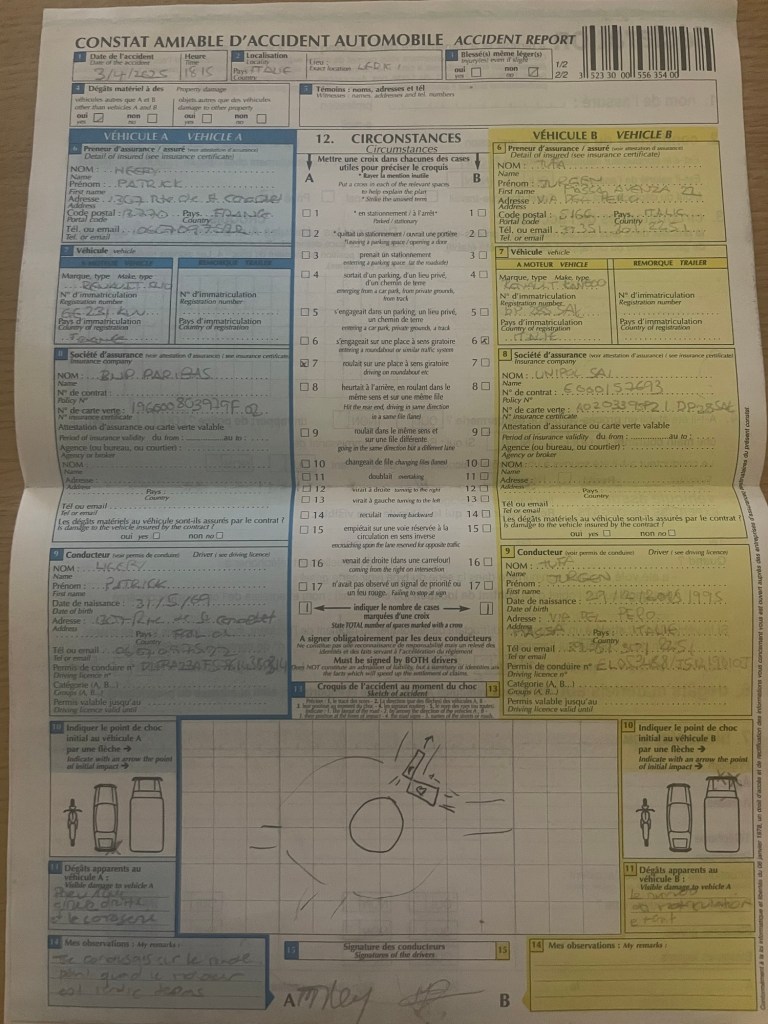 Firstly both parties fill in le constat amiable d’accident automobiie. There was a carbon copy underneath so I was able to give the other driver un exemplaire – a copy.