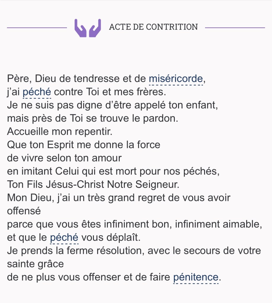 During my confession the priest, Père Noel, allowed me to say the Act of Contrition in English because the French version was so long.