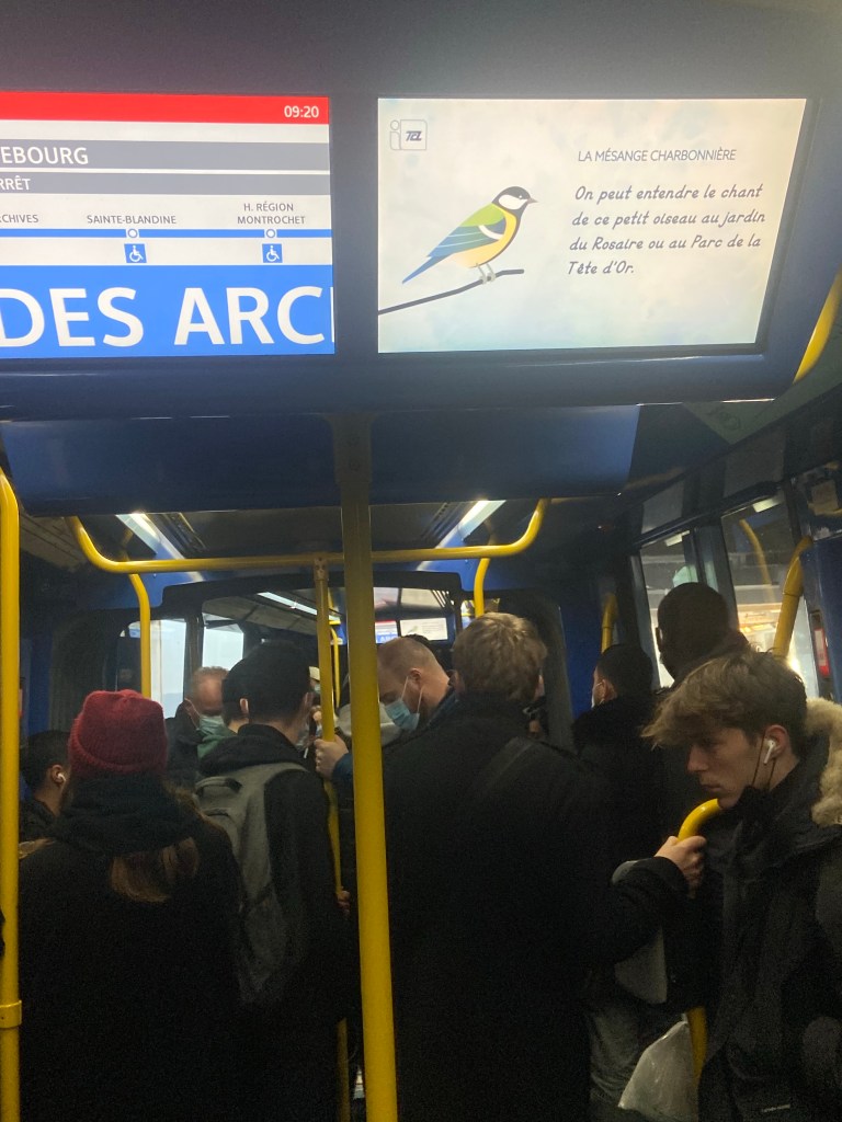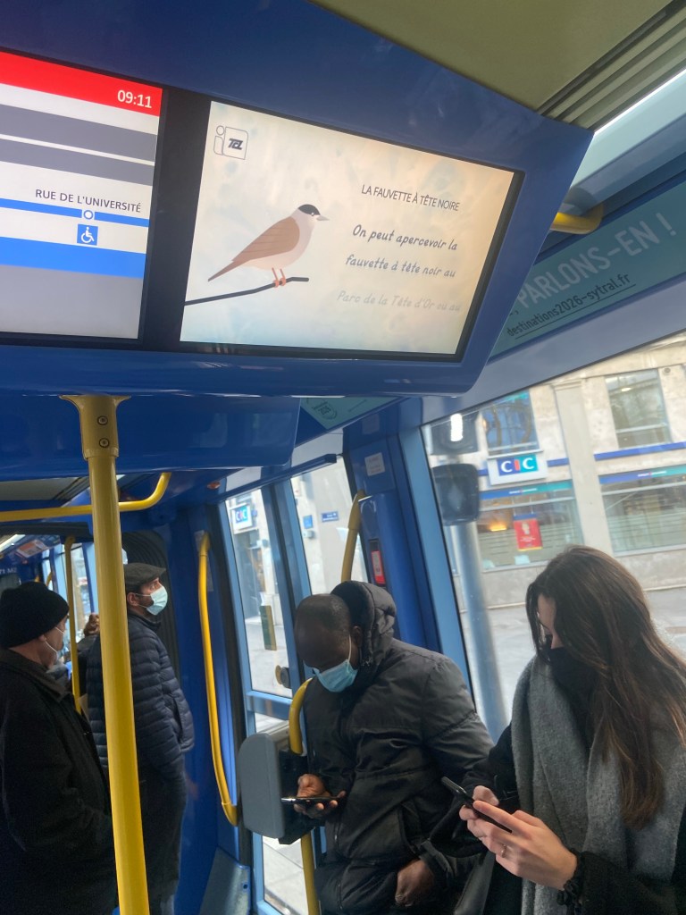 Among the bits of information scrolling through the screens on the tram such as: Comment porter un masque, Le meteo and #ilovetcl Instagram pictures there was one about the birds to watch out for in Lyon.